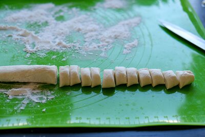 Тесто разделите на 4 части, из каждой части скатайте жгутик толщиной 2 см и порежьте поперек колечками толщиной 1 см.