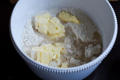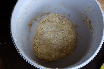 Перемешайте два вида муки с разрыхлителем. Добавьте масло, 2/3 части воды и замесите мягкое тесто. При необходимости добавляйте еще воду.