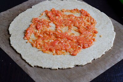 Готовое тесто раскатайте в пласт толщиной около 5 мм. Оступив 5 см от краев намажьте серединку томатным соусом.
