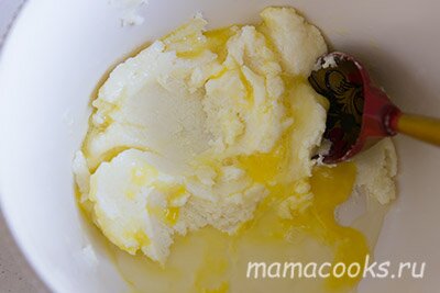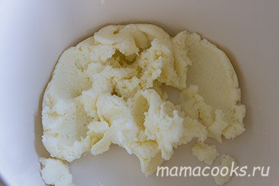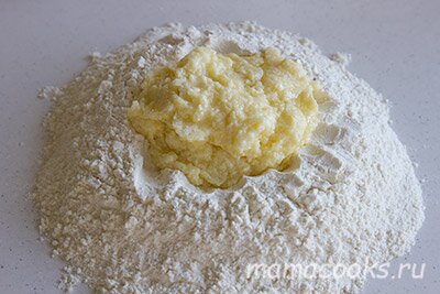 Выложите смесь в муку и замесите тесто. Оно получится довольно мягкое.