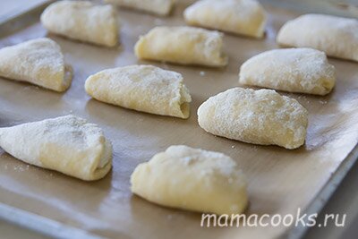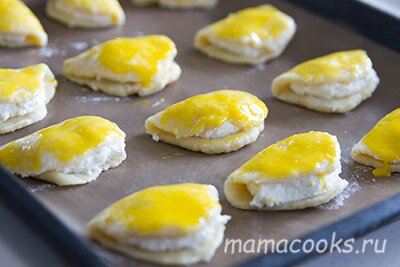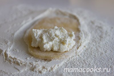 Раскатайте продолговатые лепешки, на половинку выложите творожную массу.