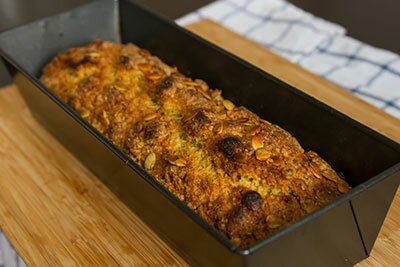 Вылейте жидкую смесь в сухую и замесите тесто. Не мешайте слишком долго, чтобы хлеб не стал резиновым. Буквально 15-20 движений ложкой, можно помочь руками в конце.
